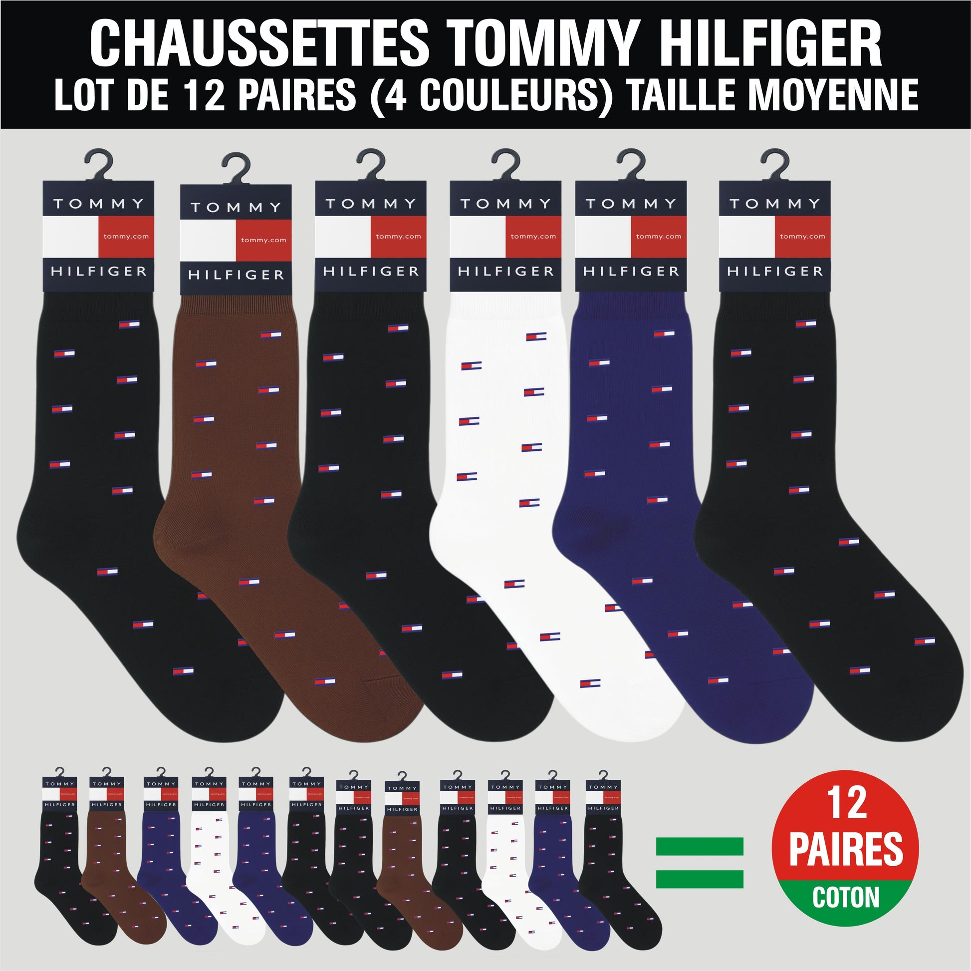 Lot de 12 Paires de Chaussettes Tommy Hilfiger – Taille Moyenne (4 Couleurs)